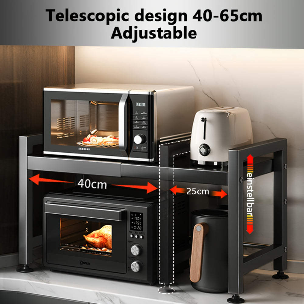 Optimize your kitchen space with this 2-tier expandable kitchen organizer. Made from durable carbon steel with a rust-proof coating, it provides a high load-bearing capacity for microwaves, dishes, bottles, and other kitchen essentials.