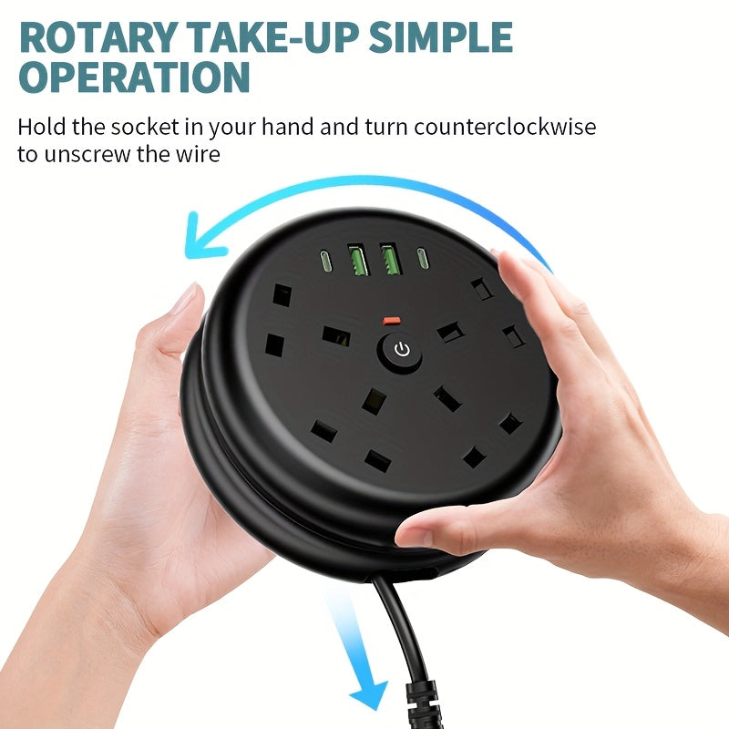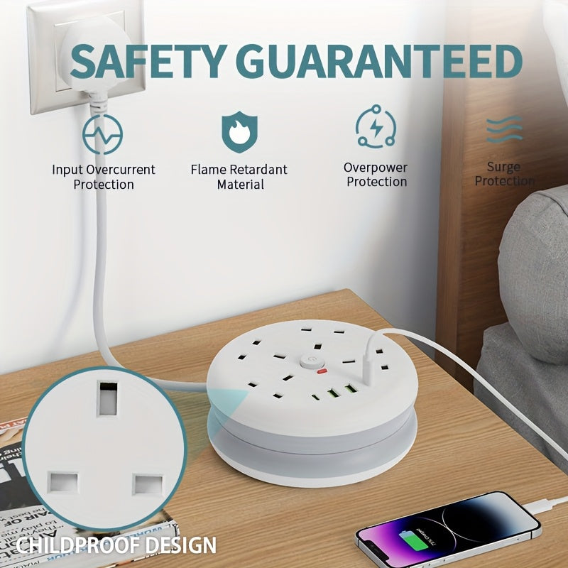 Stay connected and organized with this versatile 8-in-1 Power Strip Surge Protector, designed for home, office, kitchen, or hotel use. Equipped with 4 AC sockets and 4 USB ports, it allows you to charge multiple devices simultaneously, keeping your workspace or living area clutter-free. With a 3250W, 13A capacity, it provides reliable power while safeguarding your electronics against overloads and surges. The 2-meter retractable cord offers flexible placement and reduces cord clutter, making it ideal for desktops, countertops, or bedside tables. Compact and portable, this power strip combines functionality with convenience, ensuring your devices remain powered wherever needed. Designed with British plug specifications, it is compatible with standard UK sockets. Built-in safety features, including overload protection, provide peace of mind while using multiple devices at once. Its sleek and modern design complements any environment, from offices to living rooms. Perfect for tech-savvy households or professional spaces, this power board delivers both efficiency and safety in one stylish package.