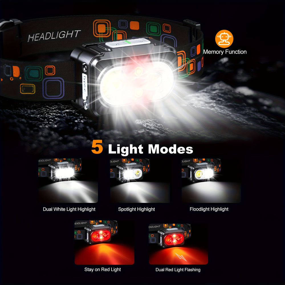 Powered by a 1200mAh rechargeable lithium-polymer battery, it provides 2–26 hours of runtime and charges quickly via a Type-C USB port. Perfect for night running, camping, hiking, biking, and other outdoor activities, this headlamp is a reliable, bright, and portable companion.