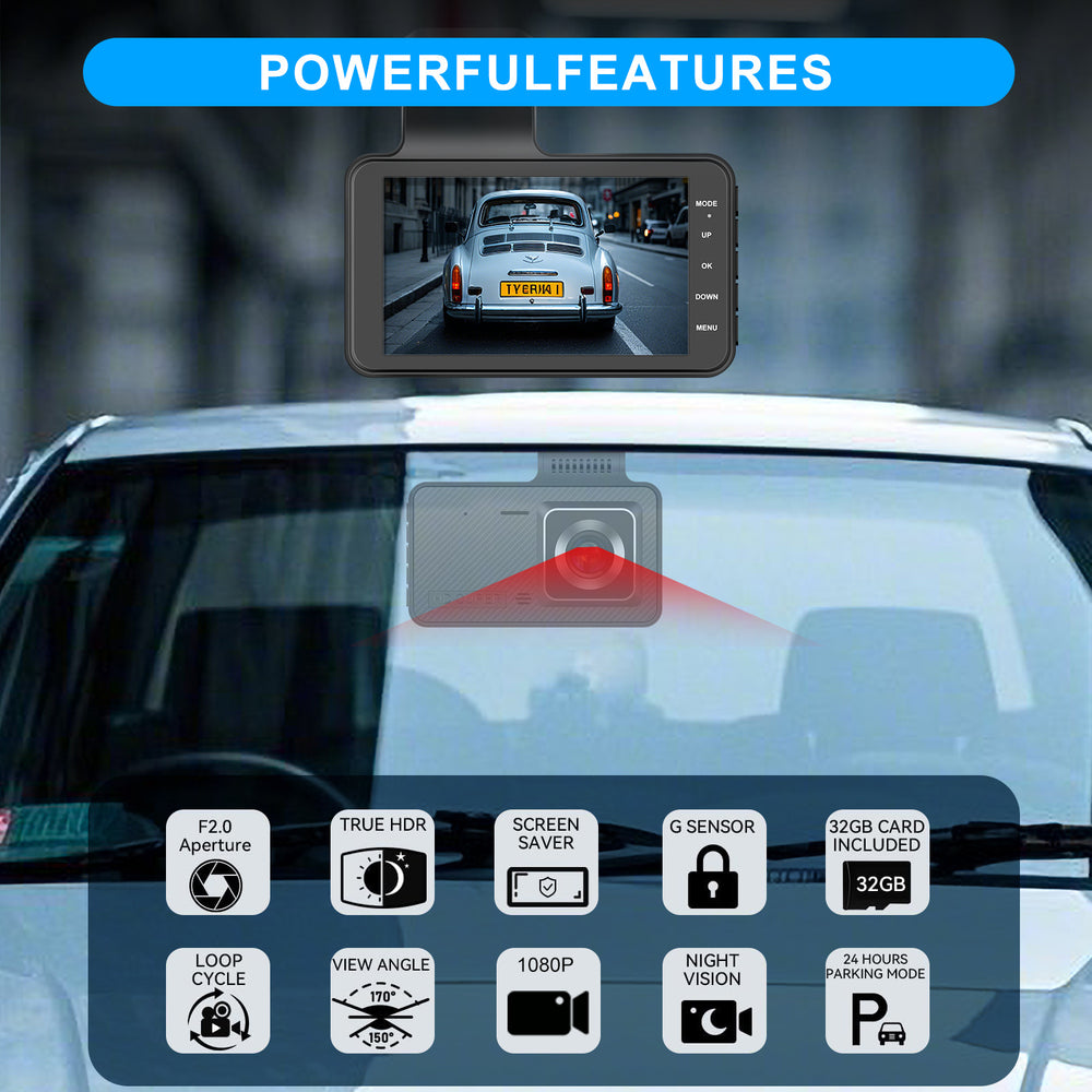 Equipped with 24-hour parking monitoring and time-lapse mode, the camera protects your vehicle even when parked (hardwire kit sold separately). The compact front cam with Type-C interface keeps your view unobstructed, and the adjustable rear camera provides full flexibility. Voice prompts keep you informed of recording status and G-sensor events, which can be customized or muted. Includes a 32GB SD card and supports up to 256GB for extended recording. Ideal for cars and trucks, this dash cam delivers reliable security and peace of mind.