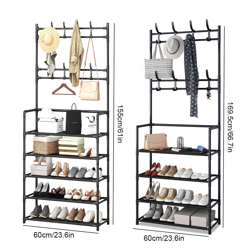 Organize your entryway or closet with this heavy-duty 4/5-tier shoe rack and coat/hat stand, designed for durability and multifunctional use. Crafted with a sturdy powder-coated finish, it provides long-lasting strength while maintaining a sleek, modern look. The tiered shelves offer ample space for shoes, boots, and other footwear, while removable hooks provide convenient storage for coats, hats, bags, or umbrellas. Its floor-standing design requires no assembly, allowing for quick setup and immediate use. Space-saving and versatile, this organizer is perfect for entryways, living rooms, bedrooms, offices, or closets. Varnished finishing ensures protection against wear and tear, keeping the rack looking stylish over time. Lightweight yet robust, it can be easily repositioned without compromising stability. The multipurpose design enhances organization while decluttering floors and maximizing available space. Ideal for families, professionals, or anyone seeking a practical and stylish storage solution, it combines functionality with modern aesthetics.