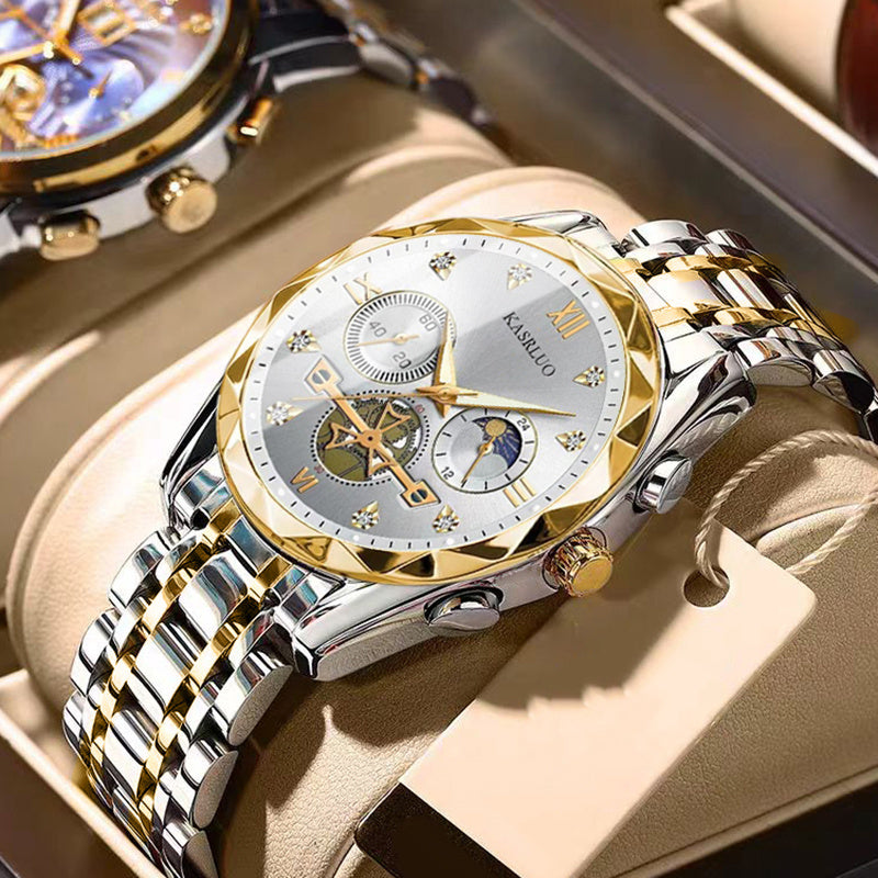 Make a bold style statement with this multifunctional men’s automatic mechanical watch, crafted for men who like modern design with a touch of elegance. The standout starry sky dial features sun, moon, and star elements, giving the watch a unique and artistic look while still keeping it classy.