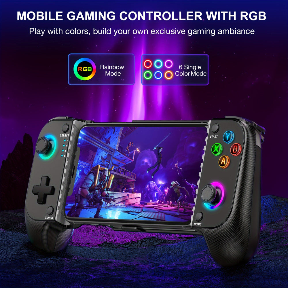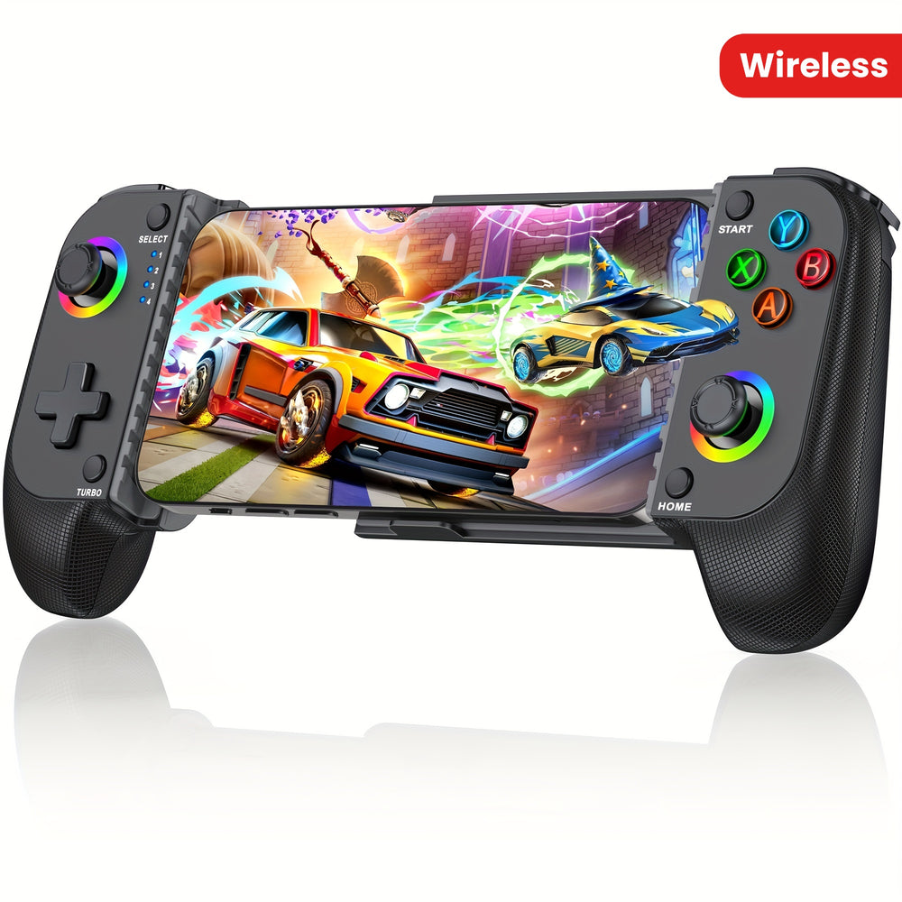 Level up your mobile gaming with this wireless game controller designed for immersive and comfortable gameplay. Featuring dynamic RGB light effects and an ergonomic grip, it delivers enhanced control and long-lasting comfort during extended gaming sessions. Compatible with both iPhone and Android phones, it connects wirelessly for smooth and responsive performance. Powered by a rechargeable nickel battery, this controller is perfect for casual players and serious gamers looking for precision, style, and portability in one compact device.