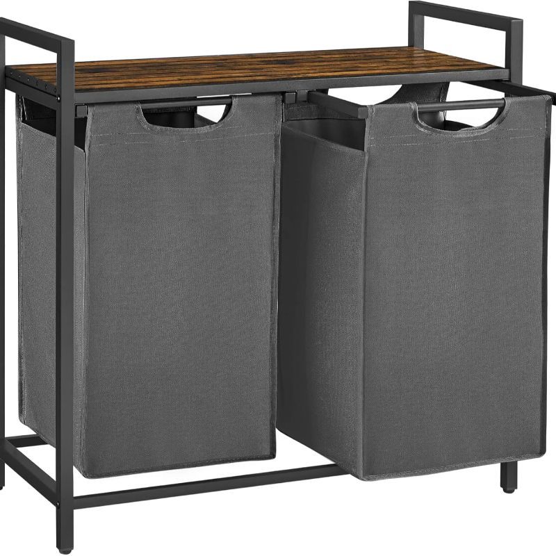 Keep your home organized with this 2-Pull-Out Removable Bags Laundry Hamper, designed for convenience and durability. Constructed with a sturdy metal frame and wood accents, it combines industrial style with practical functionality. The hamper features two removable 12.1-gallon (46L) bags, making laundry sorting easy and efficient for whites, colors, or delicates. Its rectangular shape and multi-component design provide ample space while fitting seamlessly into bedrooms, bathrooms, laundry rooms, or other spaces. A built-in shelf offers additional storage for detergents, fabric softeners, or small items, keeping everything within reach. Lightweight yet durable, the removable bags are easy to lift, carry, and clean. The industrial finish adds a modern touch, complementing a variety of home décor styles. Assembly is simple, allowing you to enjoy organized laundry storage in minutes. Ideal for families, apartments, dorms, or shared spaces, this hamper keeps your laundry area tidy and stylish.