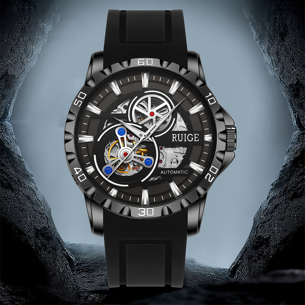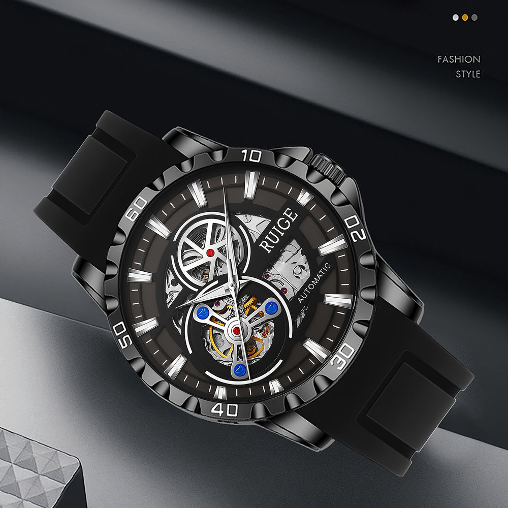 The RUIGE Men’s Luxury Automatic Mechanical Watch combines elegance, modern design, and precise engineering. Powered by a self-winding mechanical movement, it operates without a battery, making it low-maintenance and reliable.