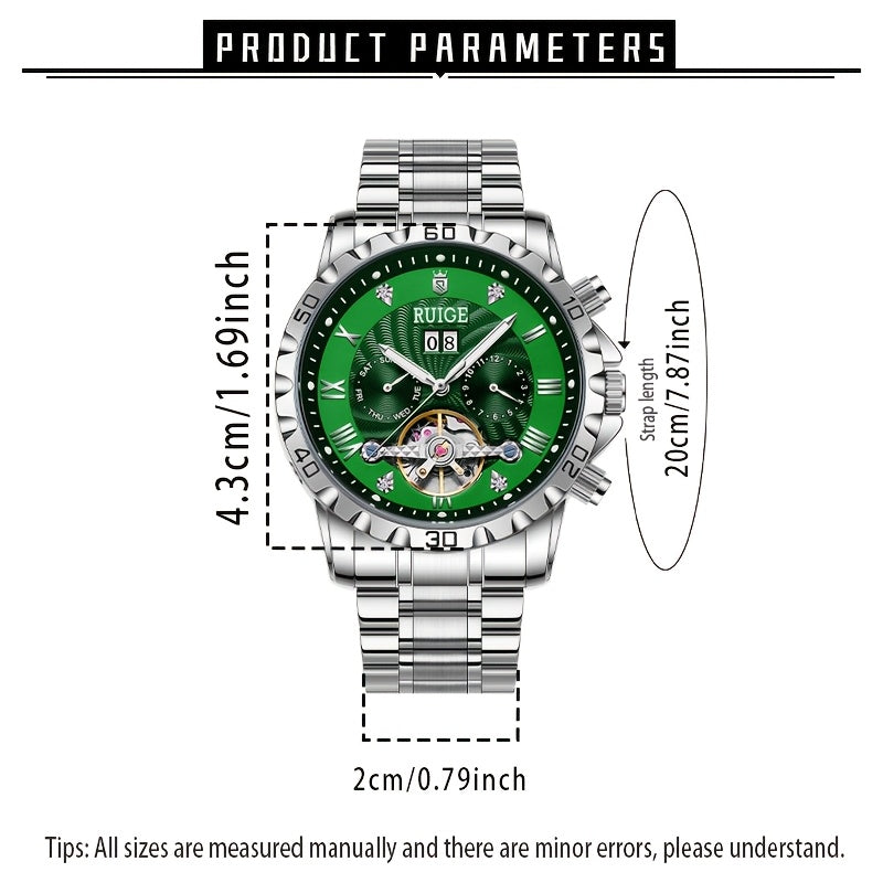 Upgrade your collection with the RUIGE Men’s Luxury Automatic Mechanical Watch. Featuring a hollow-out skeleton dial, this stainless steel strap watch combines elegance with practicality, offering both a date and calendar function. Its self-winding mechanical movement requires no battery, making it ideal for professional, business, or casual everyday use. Perfect for special occasions and gifting during Halloween, Thanksgiving, or Christmas, this timepiece blends style and functionality seamlessly.